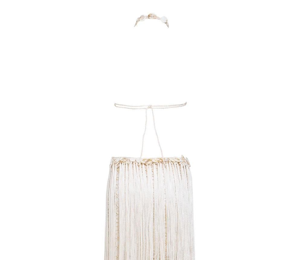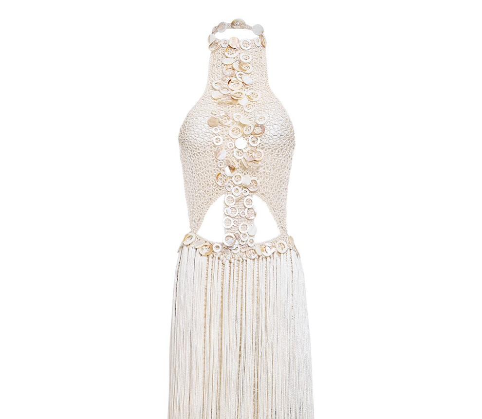 Tejido a mano en crochet marfil, con flecos que bailan con el viento y conchas que recorren la silueta como un canto al mar.
