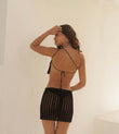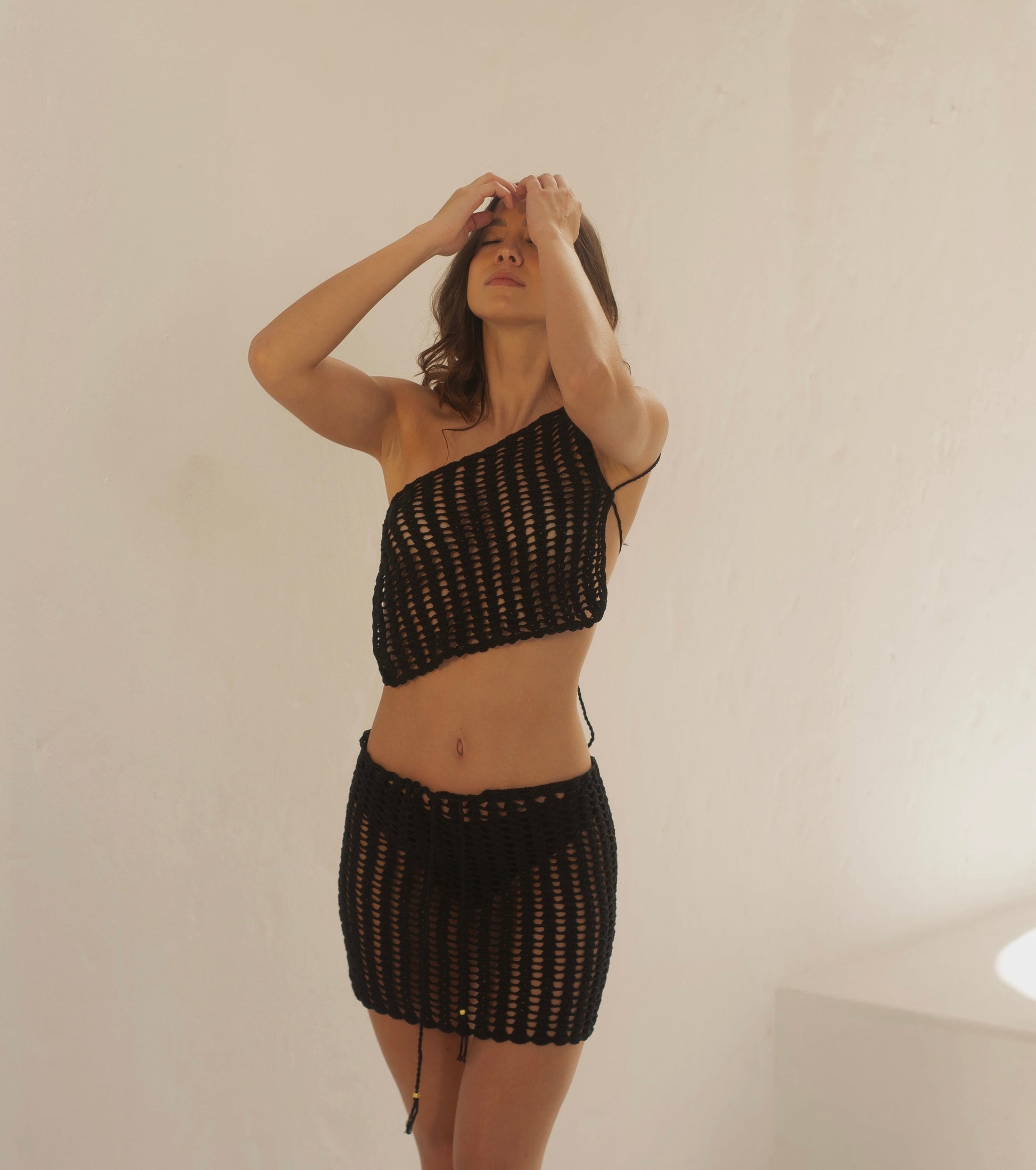 Este conjunto de ganchillo hecho a mano presenta un top versátil que puede ser estilizado de varias formas, emparejado elegantemente con una falda larga. La artesanía intrincada añade un toque único a ambas piezas, mostrando la destreza y dedicación puesta en crear este conjunto.