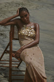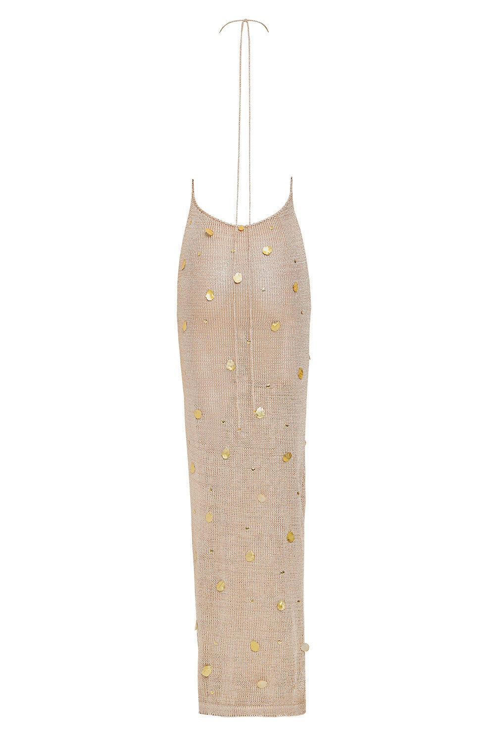 Our CALIE MAXI DRESS Inspirado en los atardeceres dorados del Caribe, este vestido representa el brillo sutil de una mujer que deja huella sin decir palabra. Cada lentejuela tejida a mano evoca el reflejo del sol sobre el mar, mientras la silueta abraza el cuerpo con la elegancia de lo eterno. Una pieza para bailar bajo las estrellas, conquistar miradas y sentirse oro en piel.