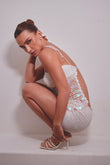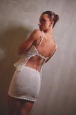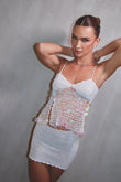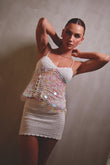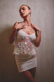 Nuestro nova sequin set combina la delicadeza del crochet con el brillo cautivador del sequin. Este diseño está compuesto por un top sutil, decorado con discos perlados que reflejan la luz, el misterio de las noches bajo la luna. La falda ajustada, hecha a mano, aporta un equilibrio perfecto entre comodidad y estilo.