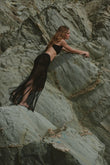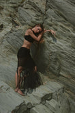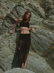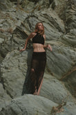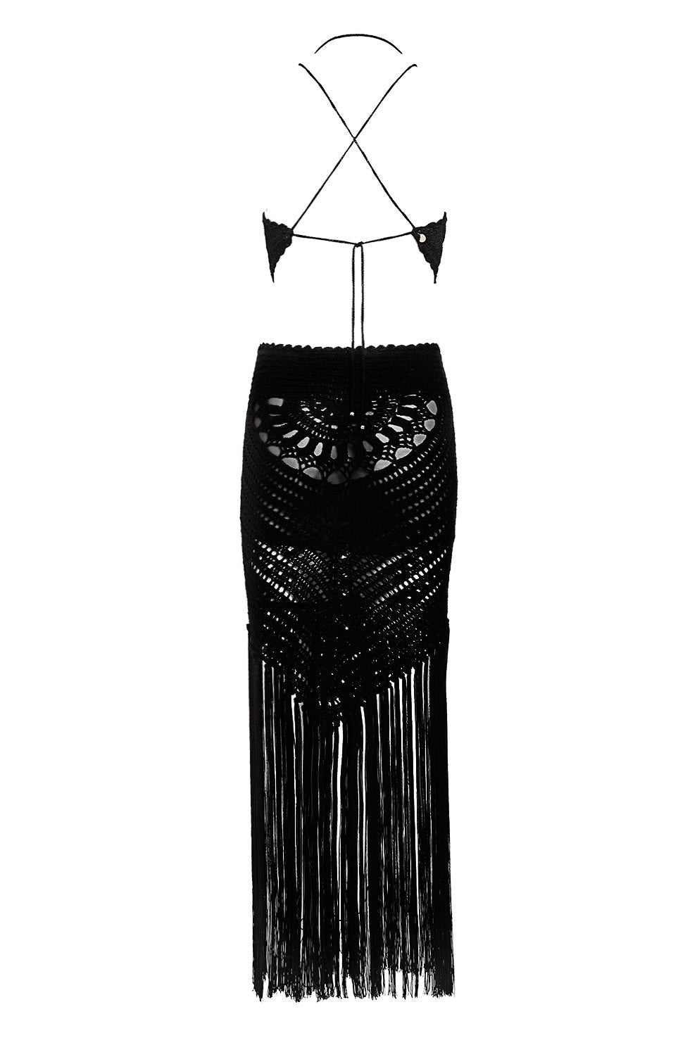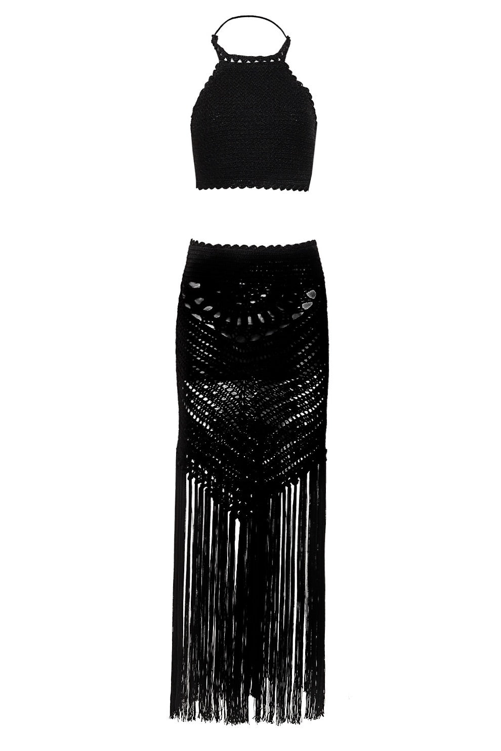 Un diseño hecho a mano en crochet que redefine el allure contemporáneo: top halter minimalista y falda con transparencias y flecos infinitos.