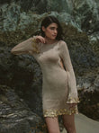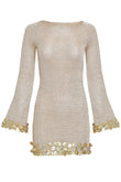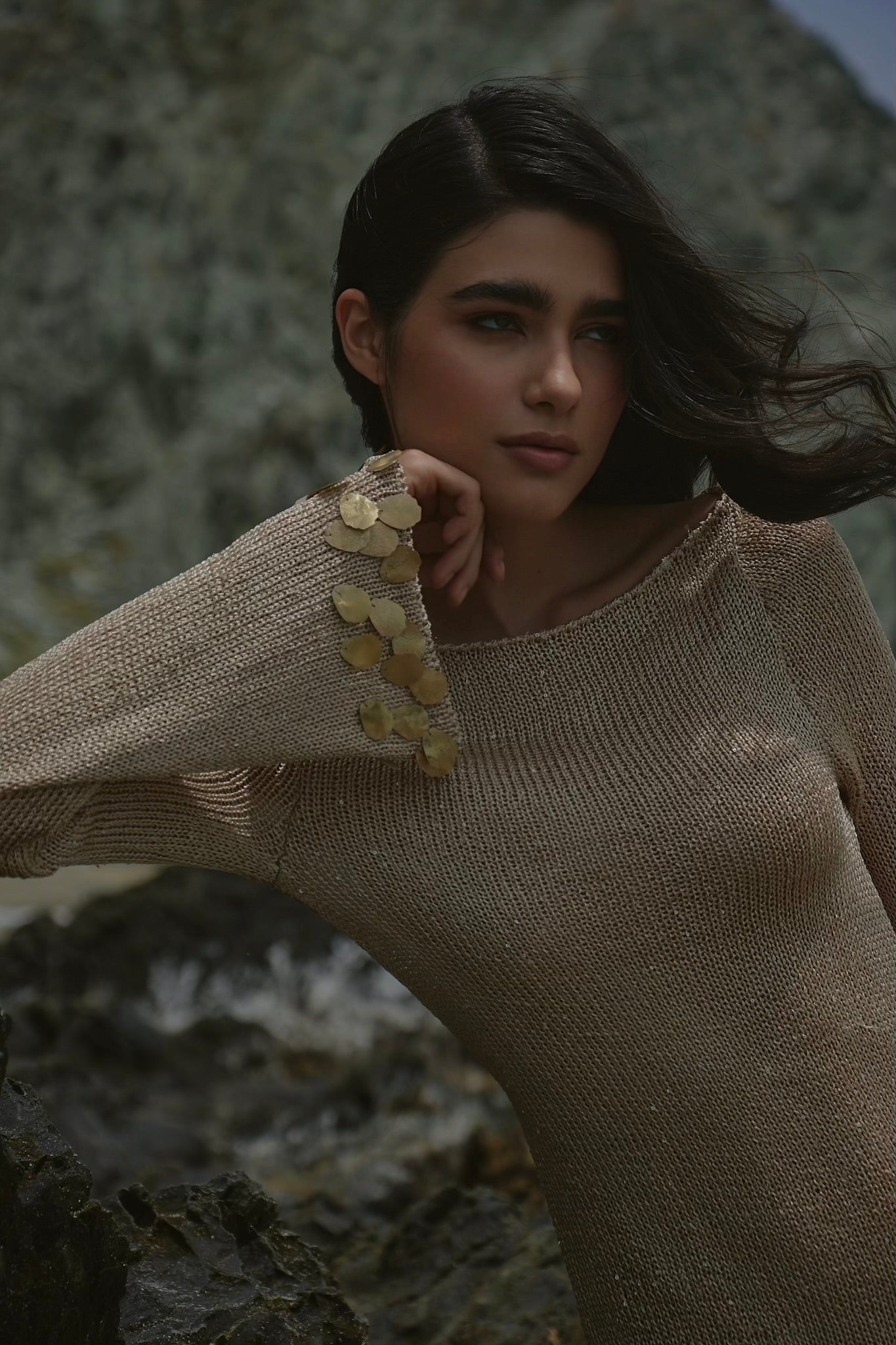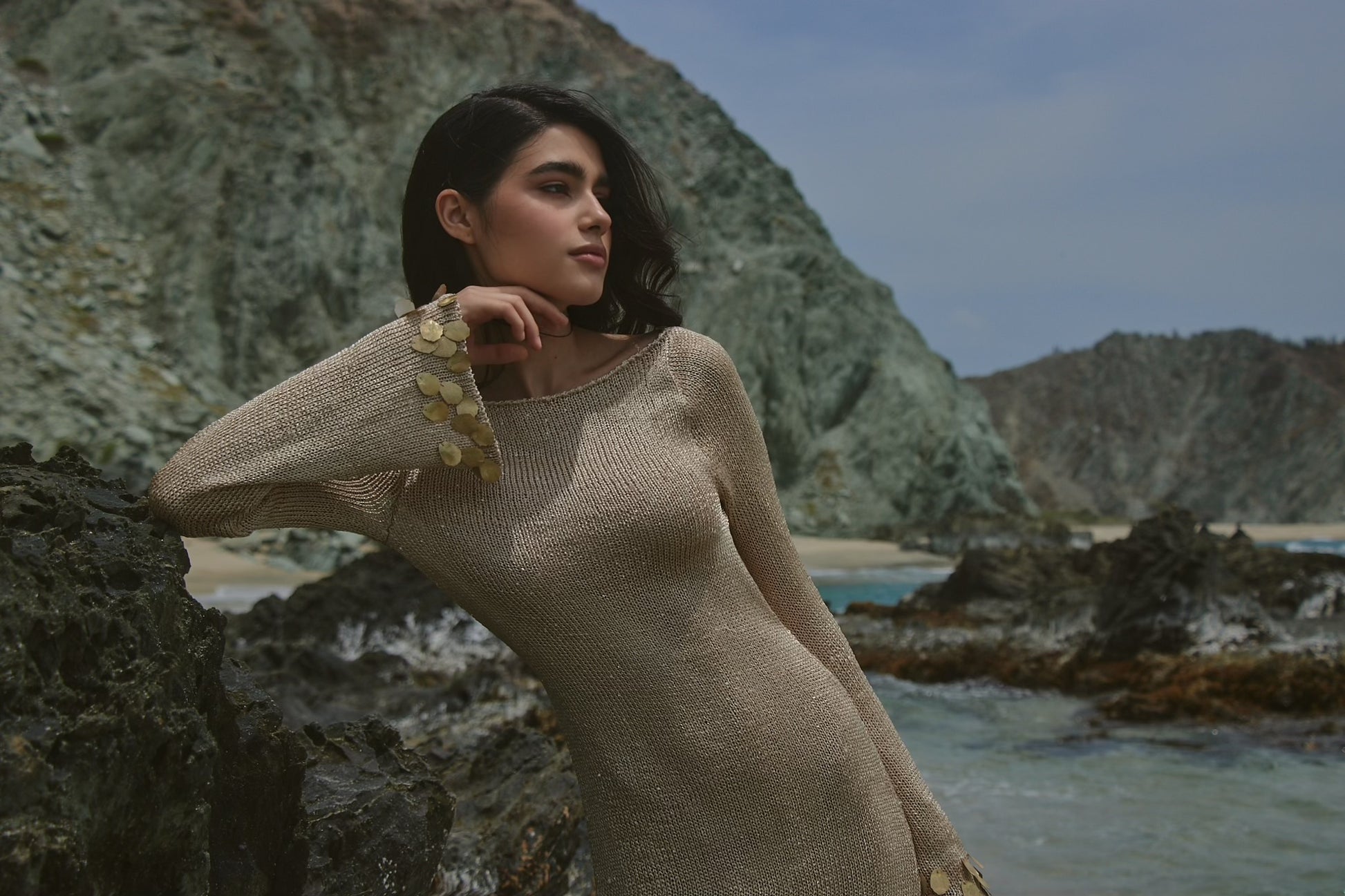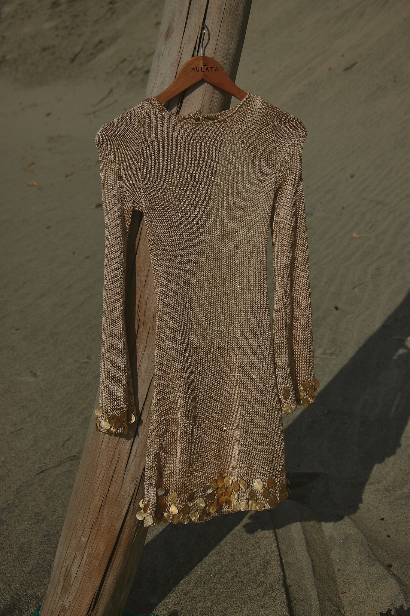 Hand-knitted with a warm sienna gold thread, this dress features an open back, flared sleeves, and a flowy silhouette that gently follows the curves. The edges are adorned with shimmering gold sequins each one sewn by hand, catching the light like reflections on calm sea water.
