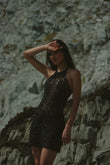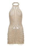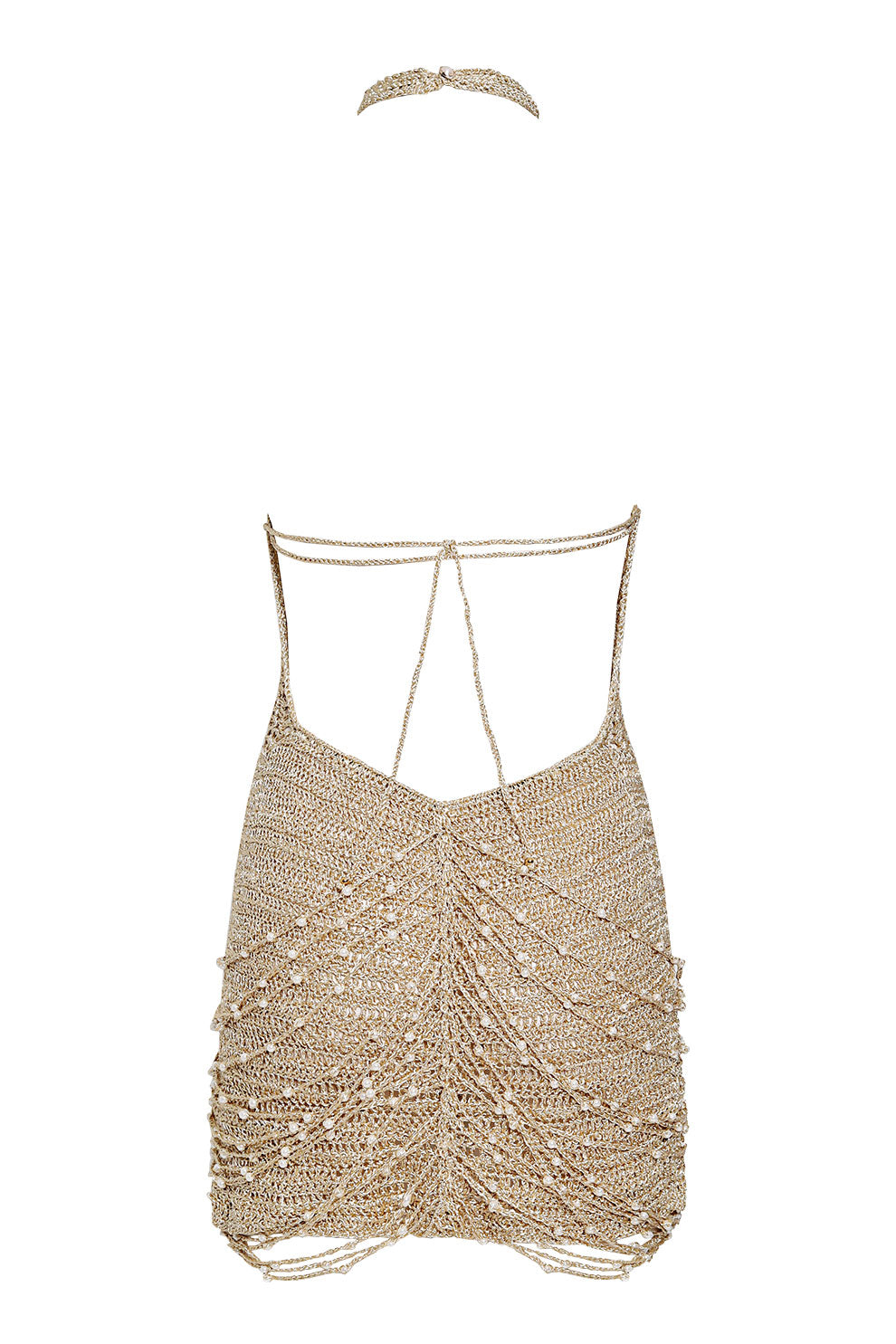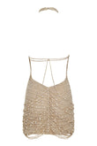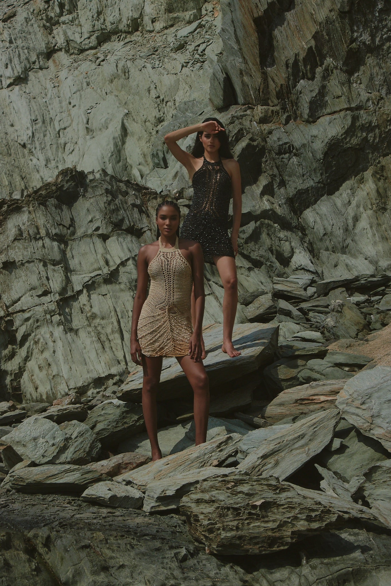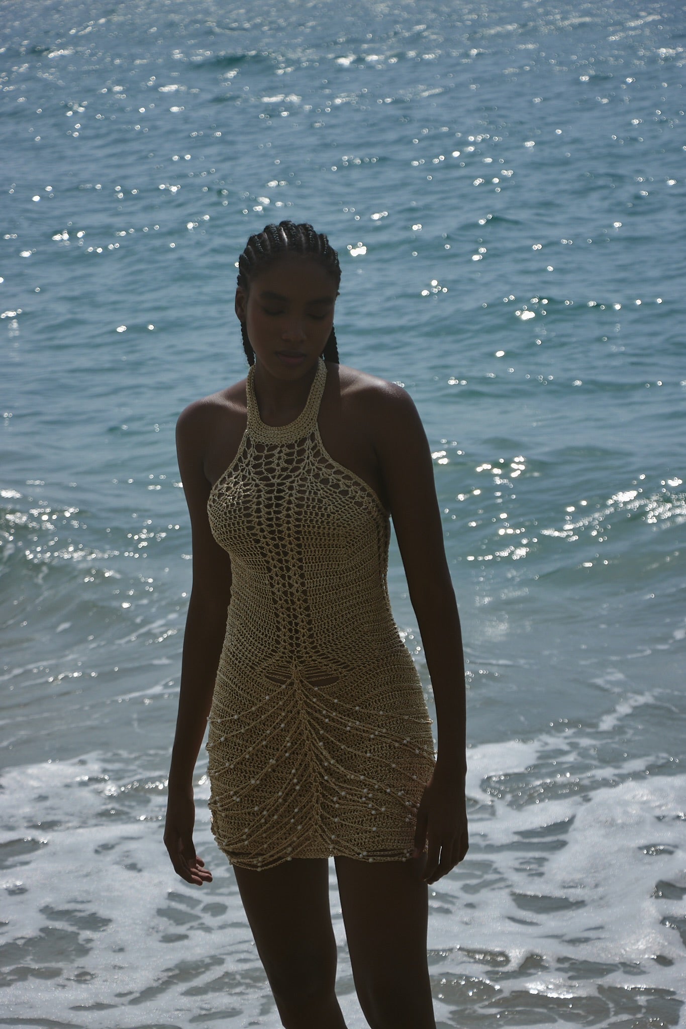 Our dune dress, tejido a mano con hilos dorados y perlas, se ajusta al cuerpo con un fruncido central que realza tus curvas de forma natural. Su espalda abierta y caída ligera lo convierten en una pieza hecha para bailar descalza, sentir la brisa y brillar con cada movimiento.