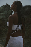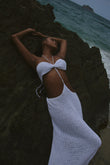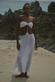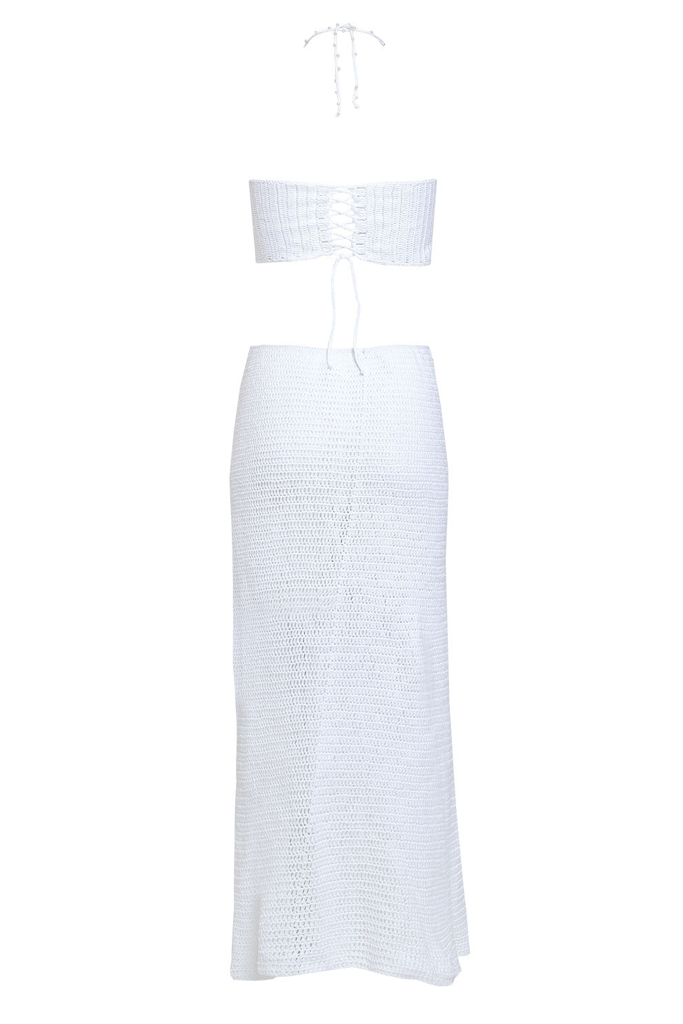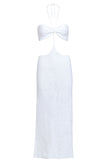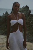 Este vestido largo 100% en crochet artesanal celebra la feminidad con un diseño elegante: top en forma de lazo unido por un delicado escote halter con detalles de mostacillas, y una falda de caída recta que enmarca la silueta con sensualidad natural. El recorte frontal revela el encanto del cuerpo con sutileza, evocando el encuentro entre mar y arena.