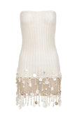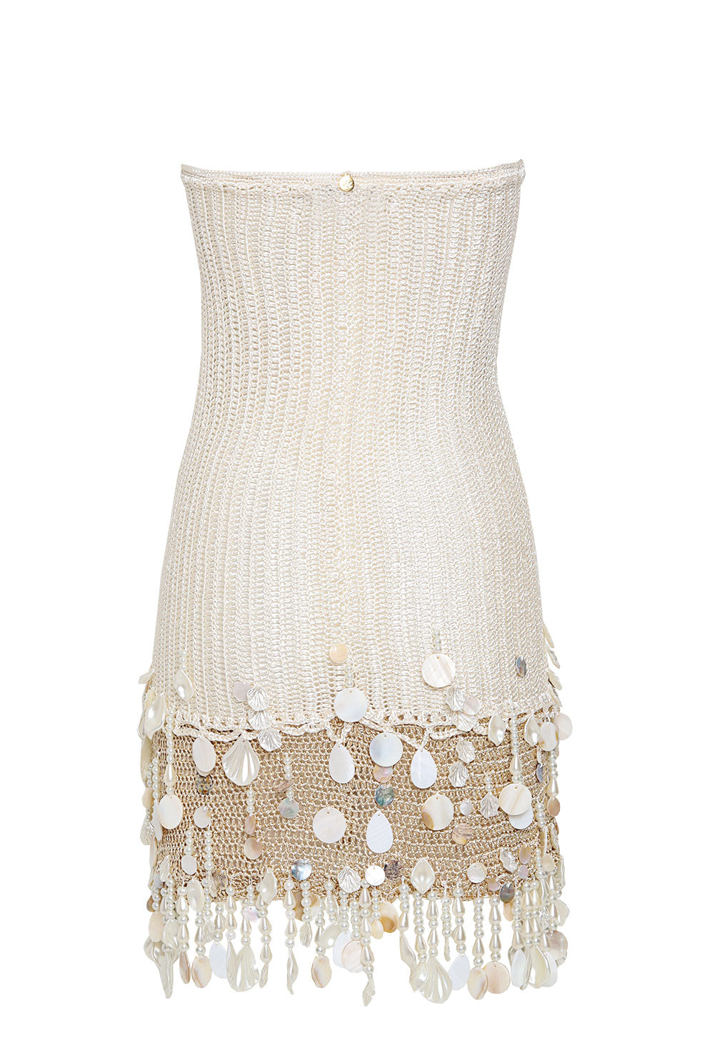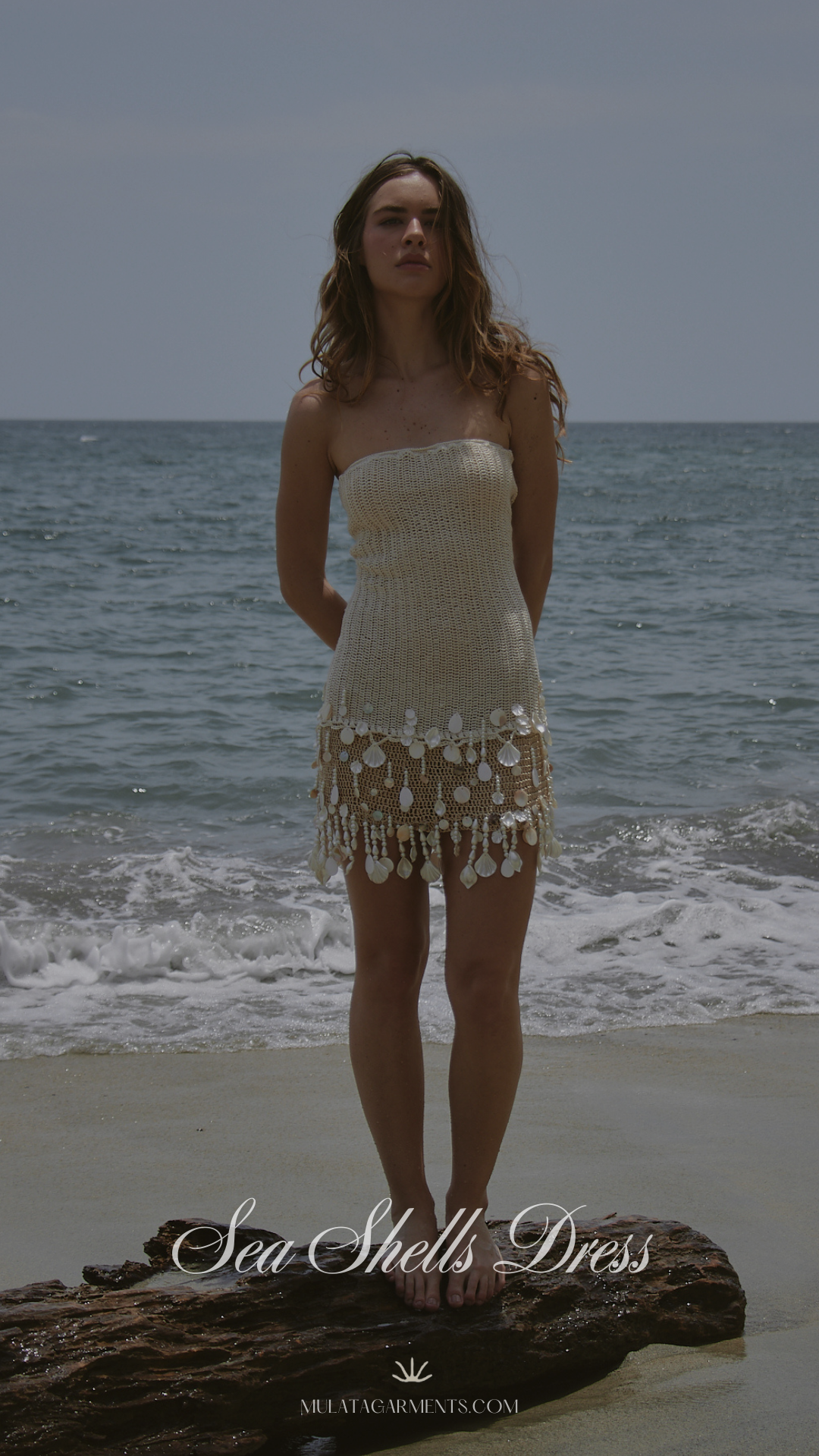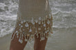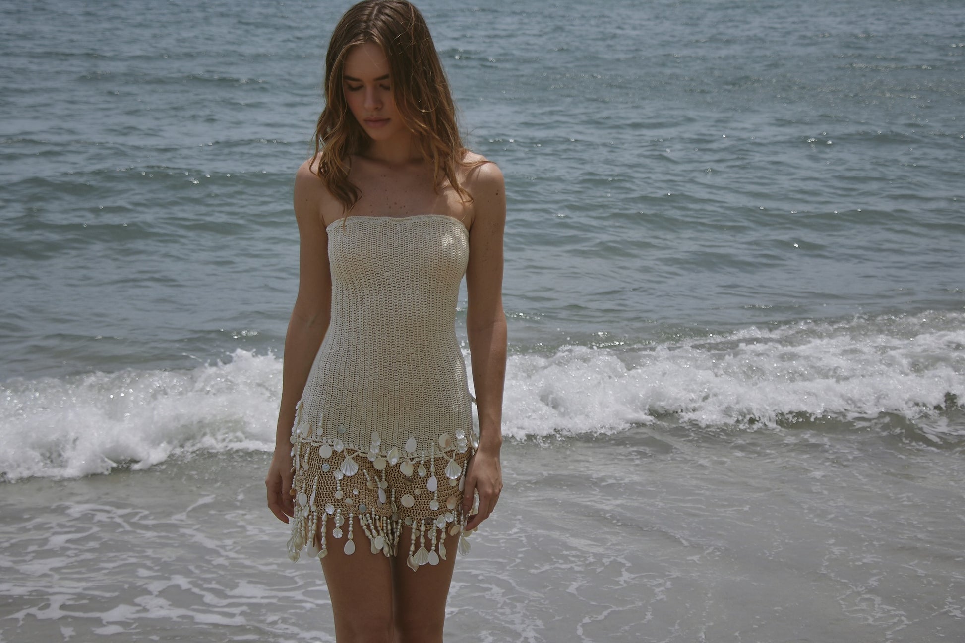 Tejido 100% a mano, abraza la silueta como una segunda piel, mientras su borde adornado con conchas naturales y flecos en movimiento baila al ritmo del viento.